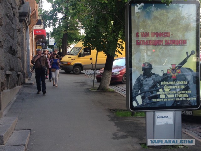 Хотите в укроармию за 7000 гривен (18 000 руб.)? Заметьте, что фразу «Есть такая профессия – Родину защищать!», украинцы взяли из советского фильма «Офицеры». Своего слогана, видать, придумать не смогли, раз уж из ненавистного им коммунистического прошлого фразы дергают.