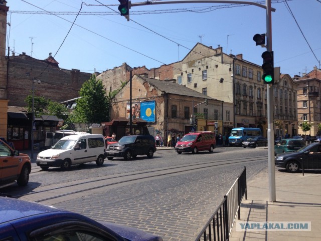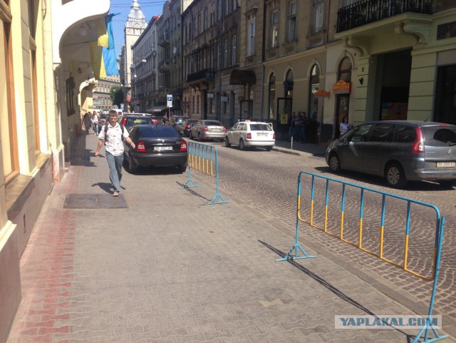 На Украине наблюдается интересная тенденция. Чем город менее украинский и чем больше русских в нем живет, тем больше там вывешивают флагов и тем больше в городе желто-голубых заборов и мусорных баков. Во Львове украинцев достаточно много, а потому жовто-блакитная шиза себя очень мало проявляет. Кроме патриотичных заграждений парковки, я почти ничего такого и не увидел.