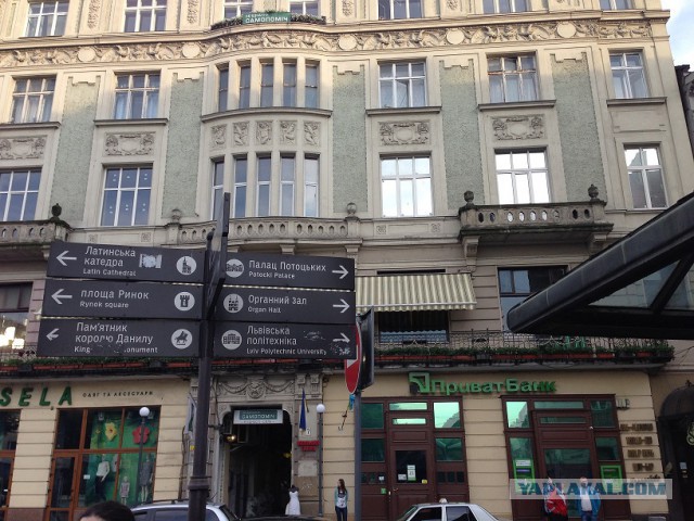 В центре города установлены удобные уличные указатели со стрелками. Все надписи на украинском языке. Перевод на английский есть. На русский нет. Хотя русским языком во Львове владеют почти все, кого я встретил, а английским мало кто.