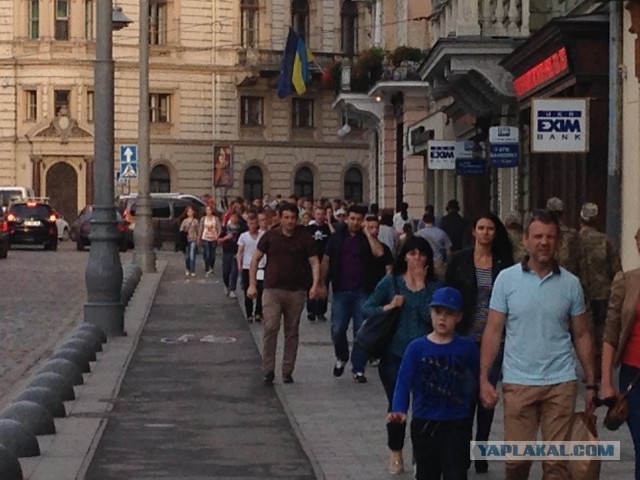 В глаза бросается большое число военных на улицах Львова. Словно война идет не на востоке, а на западе. Я не фотографировал их в упор, поэтому крупных планов с укровояками в моей фотоколлекции с Украины почти нет. Например, на одной моей фотографии видно, как один боец бежит за автобусом, а второй едет на велосипеде.