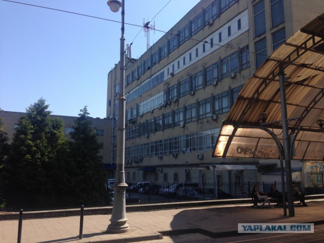 Рядом с трамвайной остановкой я заметил серое здание советской постройки. Обычно в таких домах в Советском Союзе располагались НИИ. Сперва я подумал, что строение заброшено, но потом понял, что все дело в том, что фасад прожил все 25 постсоветских независимых лет без единого ремонта. М-да… они бы лучше борьбу с коммунистическим прошлым с фасадов начали.