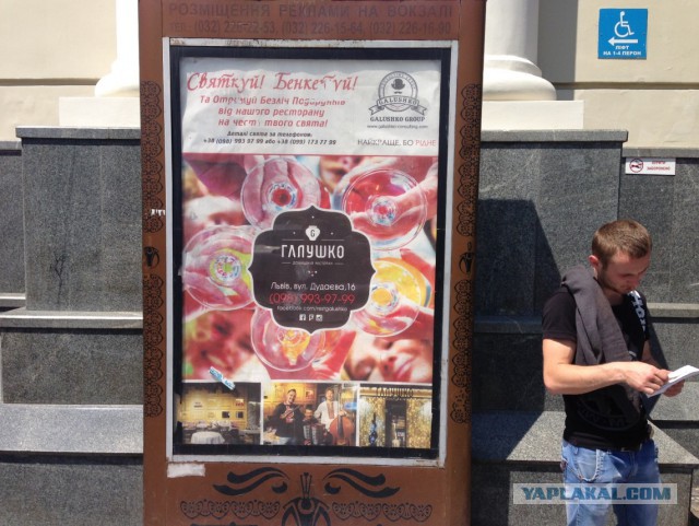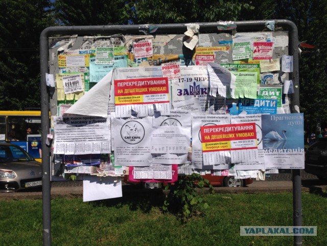 Во Львове мною был замечен еще один привет из 90-х. Бумажные объявления. Хотя, надо признать, что здесь это дело облагородили, отведя для объявлений специальный стенд. У нас же объявления исчезли под давлением интернета раньше, чем до них дошли руки у городских властей.