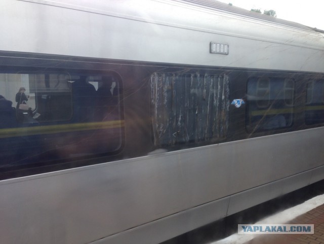 Тут надо еще понимать, что Хендай это не аналог нашего Сапсана. Это аналог нашей Ласточки. И один из минусов Хендая в том, что в отличие от Ласточки, производство которой налажено под Екатеринбургом, корейский поезд целиком покупается за границей. А, следовательно, любую запчасть для него тоже нужно везти из-за моря. Поэтому иногда случаются такие вещи, как на одной из моих украинских фотографий, когда стекло в поезде разбили, а замены ему пока нет.