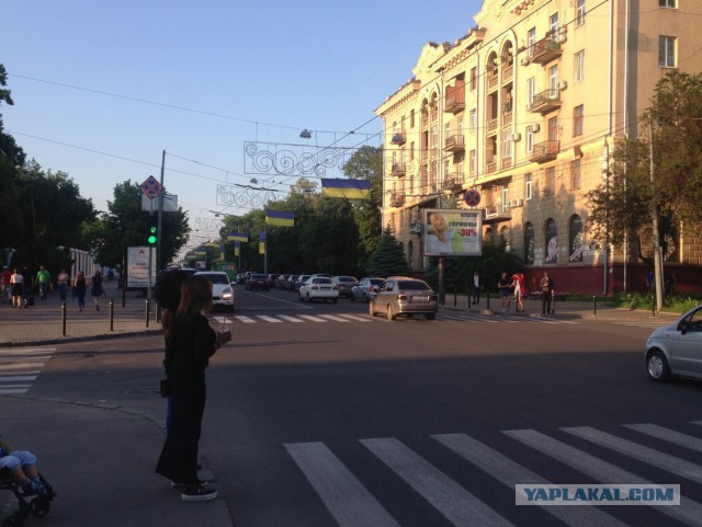 Желто-голубые флаги висят не просто у каждого здания и даже не на каждом столбе. Они, словно бело-красные фашистские штандарты со свастикой, аккуратно развешаны на специальных тросиках через каждые метров тридцать. Концентрация жовто-блакитных полотен на квадратный метр в Харькове максимальная из всех городов, где я был. Столько флагов нет ни в Киеве, ни во Львове.