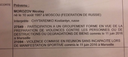 Николай Морозов: — Я вовсе не для этого приехал в Марсель, я приехал как турист на футбольный матч. Днем я поел в ресторане, весь день наблюдал пьяных английских фанатов — они устраивали провокации, я не отвечал. И когда гулял, группы наших я тоже встречал. Стал ходить с одной группой. Впереди началась стычка, там была полиция, я понял, что становится опасно и минуты через три ушел в сторону Нотр-Дам-де ля Гард.
