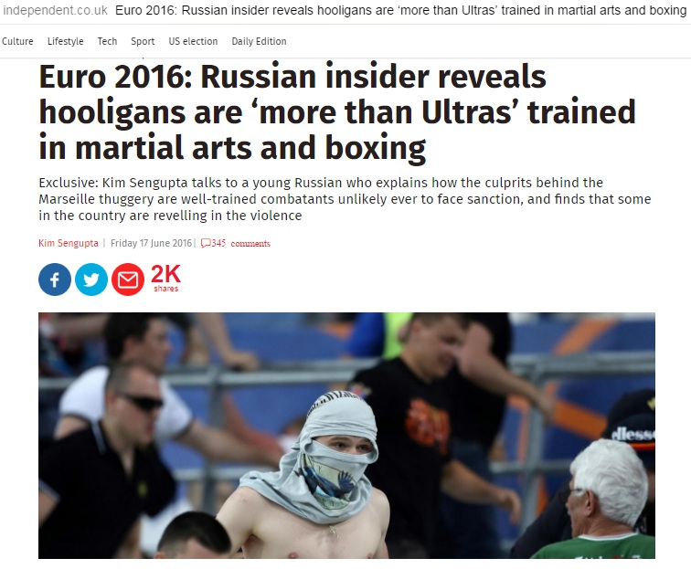 Во всяком случае, именно об этом в своей статье: «Евро 2016: осведомленный русский рассказывает, что российские фанаты — “больше, чем ультрас» пишет журналист британской газеты Ким Сенгупта.