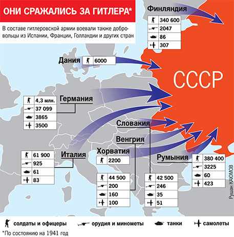 Некоторые страны, формально в войне не участвовавшие, пополнили гитлеровскую армию добровольцами. Например, из Испании на фронт отправилась Голубая дивизия, через которую за время войны прошло около 47 тысяч солдат. Голубая дивизия участвовала в блокаде Ленинграда, а испанские летчики бомбили нашу северную столицу. Всего испанцы потеряли 5 тысяч человек убитыми. Вишистская Франция пополнила гитлеровскую армию Французским добровольческим легионом против большевизма.