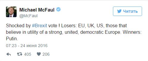 Бывший посол США в России Майкл Макфол прокомментировал результаты голосования в Великобритании, назвав их победой Владимира Путина.