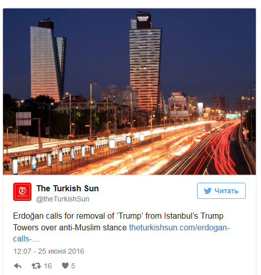 Эрдоган считает, что Дональд Трамп «не имеет терпимости к мусульманам в Америке», именно из-за этого его имя «должно быть оперативно демонтировано» с одной из башен.