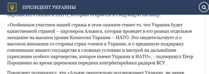 Это свидетельствует и о высоком внимании со стороны стран-членов к Украине, и о преданную поддержку союзниками нашего государства в сложных условиях и настрой на дальнейшее укрепление особого партнёрства, которое имеют Украина и НАТО», — приводятся слова Порошенко на официальном сайте украинского лидера.