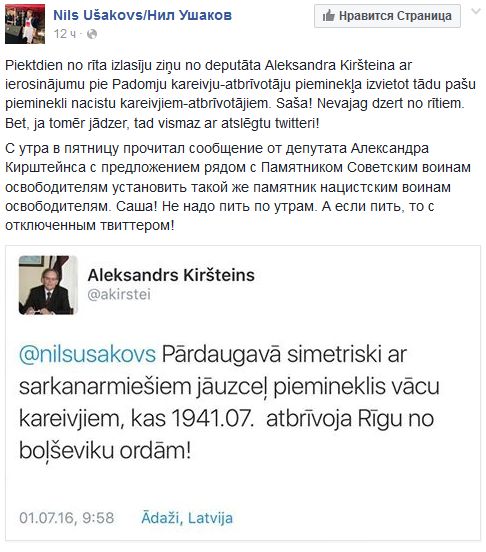 «С утра в пятницу (1 июля — прим. ред.) прочитал сообщение от депутата Александра Кирштейнса с предложением рядом с Памятником Советским воинам-освободителям установить такой же памятник нацистским воинам-освободителям. Саша! Не надо пить по утрам. А если пить, то с отключенным Тwitter!» — написал мэр Риги Ушаков на своей странице в Facebook в ответ на предложение депутата.