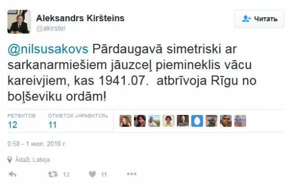 «В Пардаугаве, симметрично красноармейцам, нужно возвести памятник немецким военным, которые в июле 1941 года освободили Ригу от орды большевиков», — написал Кирштейнс в Twitter.