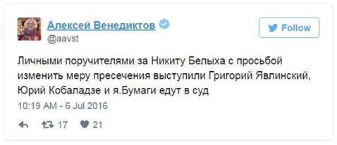 «Личными поручителями за Никиту Белыха с просьбой изменить меру пресечения выступили Григорий Явлинский, Юрий Кобаладзе и я. Бумаги едут в суд», — сообщил главред либерального СМИ.