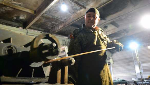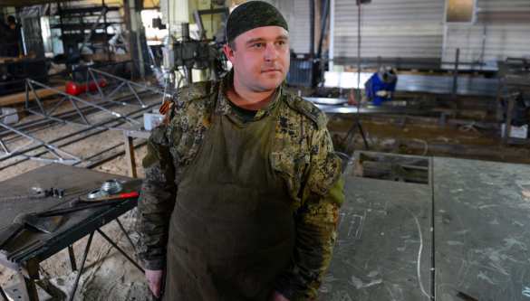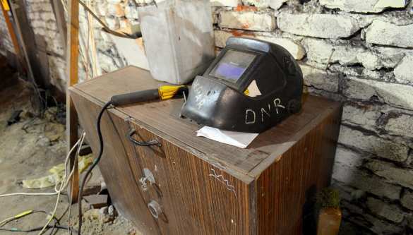 В качестве рабочей одежды Артём использует славянский камуфляж с георгиевской ленточкой. Форма износилась, в люди не наденешь, а выбрасывать жалко. На сварочной маске гордо вывел латиницей — DNR.