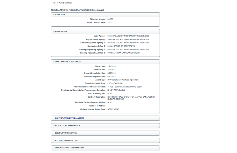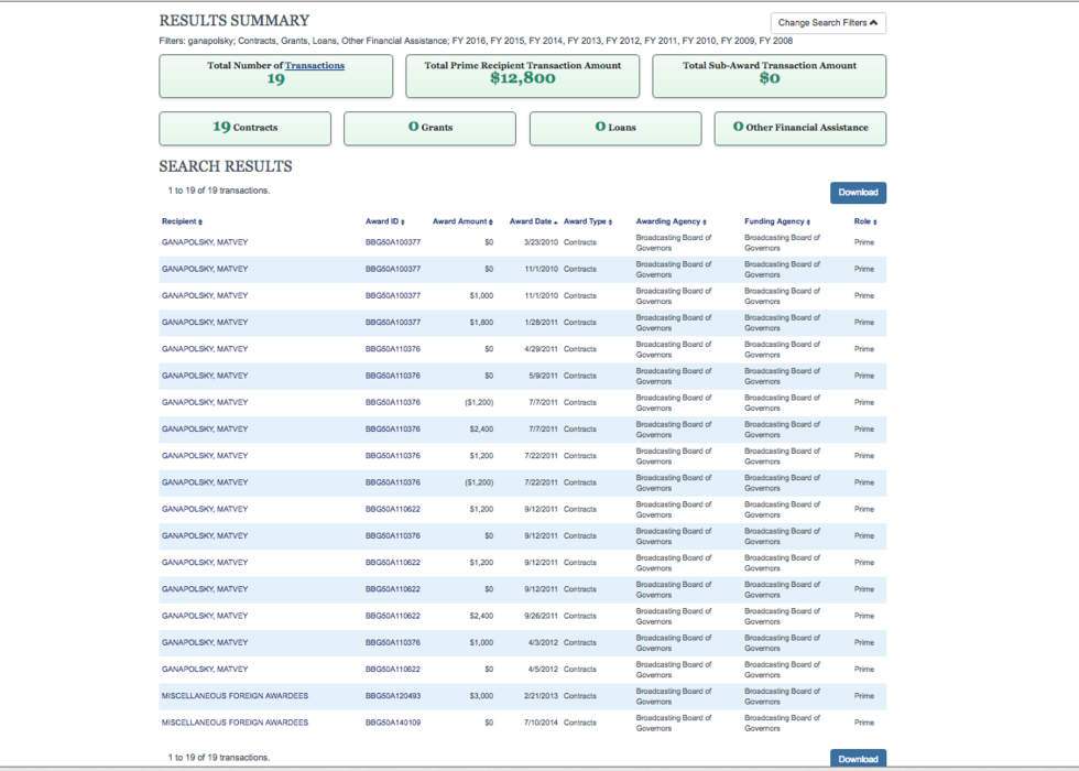 Скандальный журналист Матвей Ганапольский, известный своими критическими высказываниями в адрес российского правительства, получал денежные средства от американского правительственного агентства BBG. Об этом свидетельствуют открытые данные с сайта госзакупок США.