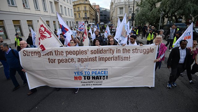 Жители польской столицы, где проходит саммит НАТО, вышли на улицы с протестами против деятельности Североатлантического альянса.