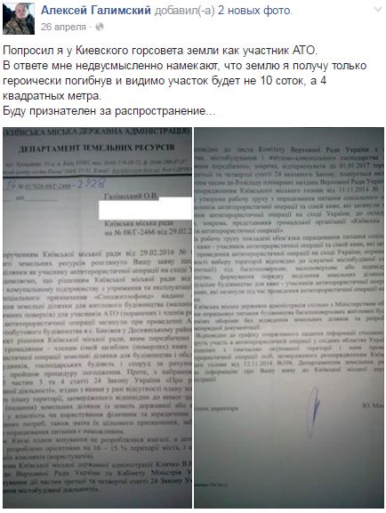 «Попросил я у Киевского горсовета земли как участник «АТО». В ответе мне недвусмысленно намекают, что землю я получу, только героически погибнув и, видимо, участок будет не 10 соток, а 4 квадратных метра», — написал он 26 апреля 2016 года.