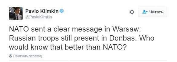 Несколькими часами ранее министр иностранных дел Украины написал: «Кому, как не НАТО, знать о присутствии российских войск на Донбассе?»