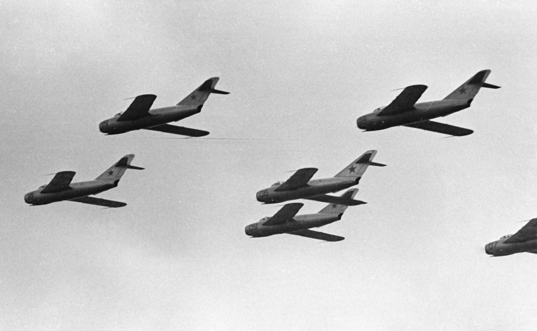 Первое поколение — стреловидное крыло, околозвуковая скорость, использование неуправляемых ракет как вспомогательного вооружения. К этому поколению относят Миг-15, Ла-15, МиГ-17, F-86, F-105.