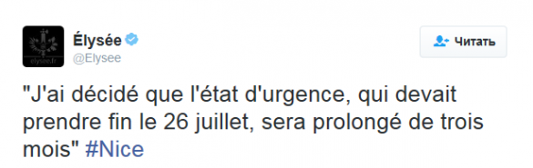 «Я решил, что чрезвычайное положение, которое должно было закончиться 26 июля, будет продлено на три месяца», — приводит слова Олланда Twitter Елисейского дворца.