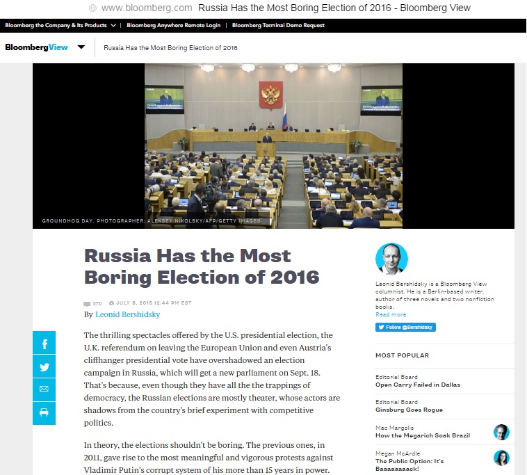 8 июля 2016 года в американском издании Bloomberg вышел материал под названием «Самые скучные выборы 2016 года пройдут в России» (Russia Has the Most Boring Election of 2016).