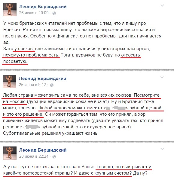 На своей личной странице в Facebook Бершидский идет еще дальше, не стесняясь публично называть своих соотечественников «совком», употреблять нецензурную лексику, комментируя политические решения Москвы, и с сарказмом отзываясь не только о политике, но и о других сферах — например, спорте.