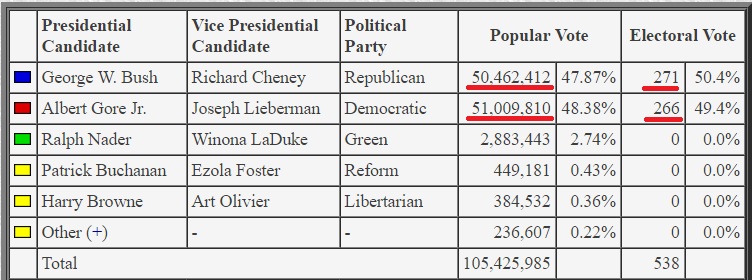 В частности, именно такая коллизия имела место в 2000 году, когда Альберт Гор уступил Джорджу Бушу-младшему 5 голосов выборщиков, набрав при этом на полмиллиона больше голосов простых американцев.