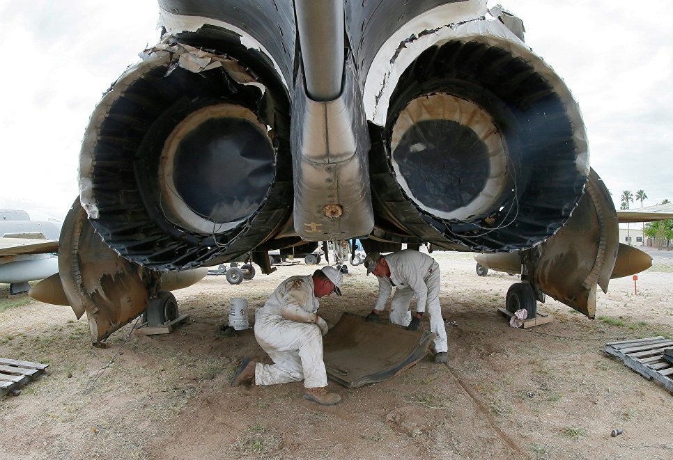 Военнослужащие 309-й группы по обслуживанию и ремонту авиакосмической техники снимают оборудование для крепления ракет с бомбардировщика F-4 «Фантом» на авиабазе ВВС США «Девис-Монтен» в Тусоне, Аризона