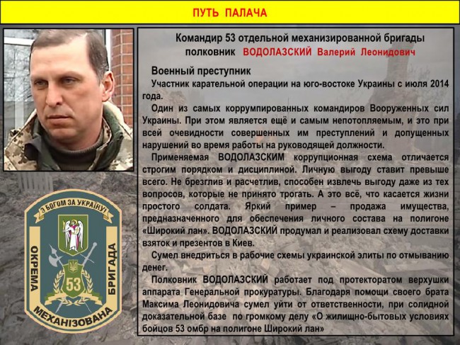 Известен полковник Водолазский и как провокатор – по его приказу обстреливалась 57-я бригада ВСУ с целью выдать это за огонь со стороны ополченцев.