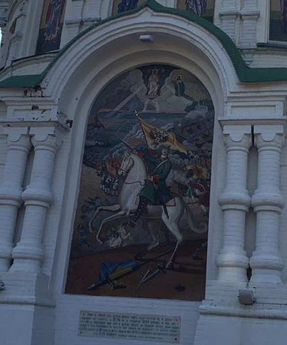 Советник министра внутренних дел Украины Авакова, бывший народный депутат из Тернопольской области Михаил Апостол возмутился фреской, изображенной над входом в один из храмов в Полтавской области, где конь российского императора Петра I «топчет украинский флаг».