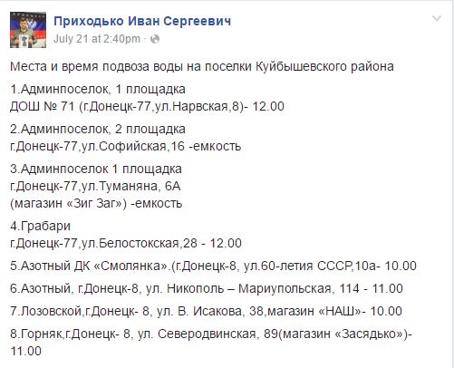 «Дорогие жители района, в частности жители пос. Азотного, пос. Горняк, пос. Грабари. В связи с критической ситуацией, сложившейся после сегодняшнего ночного обстрела по электроснабжению Донецкой фильтровальной станции, районной администрацией будет организованна подача воды по графику», – буквально на прошлой неделе писал глава Киевского и Куйбышевского районов Донецка Иван Приходько.