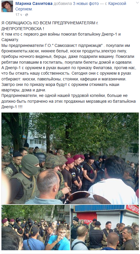 Общественная организация бывшего Днепропетровска (ныне Днепр) «Самозащита предпринимателей» пожаловалась на боевиков карательных батальонов.