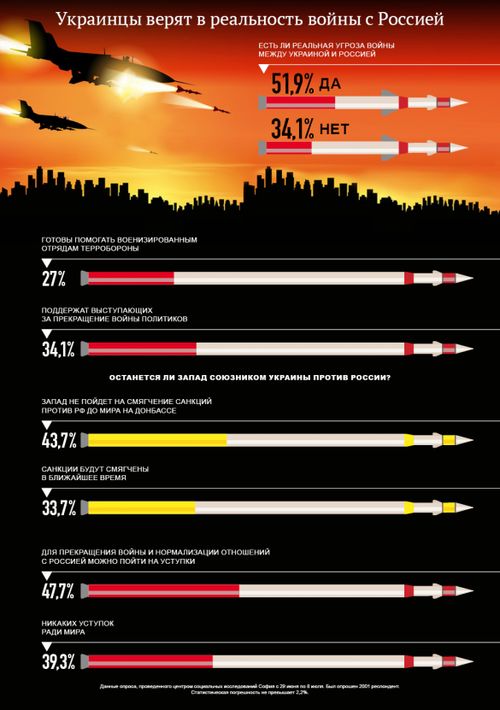 Но участвовать в этом конфликте согласились всего 27% опрошенных — и это при условии, что вопрос стоял только об оказании помощи отрядам территориальной обороны. О непосредственном участии, очевидно даже спрашивать побоялись. Если кто сомневается, то опрос совсем свежий — проводился с 29 июня по 8 июля 2016 года.