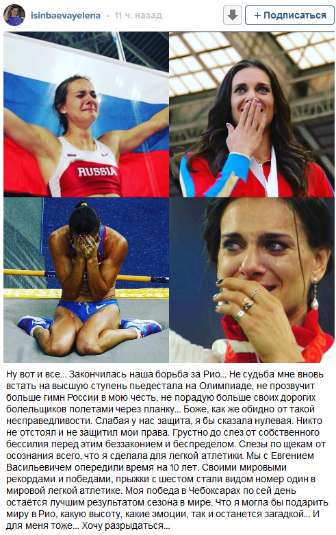 «Ну, вот и все... Закончилась наша борьба за Рио... Не судьба мне вновь встать на высшую ступень пьедестала на Олимпиаде, не прозвучит больше гимн России в мою честь, не порадую больше своих дорогих болельщиков полетами через планку...