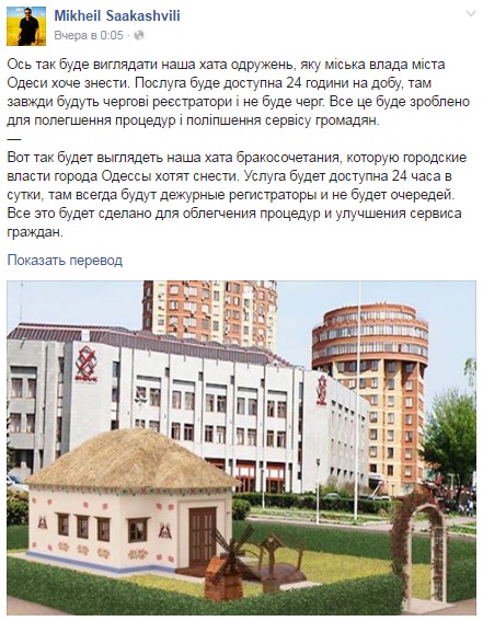 Губернатор Одесской области Михаил Саакашвили заявил, что собирается создать в Одессе круглосуточный центр экспресс-свадеб. При этом он назвал будущее учреждение «хатой бракосочетаний», что, по-видимому, должно напоминать о внешнем сходстве здания с традиционной украинской избой.