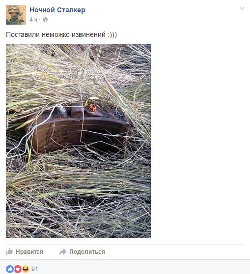 Судя по его аккаунту, наполненному свидетельствами его пребывания в зоне «АТО», и снимкам различных мин и взрывных устройств, он является сапером и его пост не является пустым звуком, то есть мина действительно была поставлена.