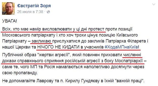 Архиепископ Евстратий (Зори), глава Черниговской епархии УПЦ КП, возглавляющий одновременно информационное управление «Киевского патриархата» пошел еще дальше. 26 июля со своей страницы в Facebook священнослужитель призвал «всех, кто намерен выражать в эти дни протест против позиции Московского патриархата» ничего не бросать (!) в участников Всеукраинского Крестного хода.