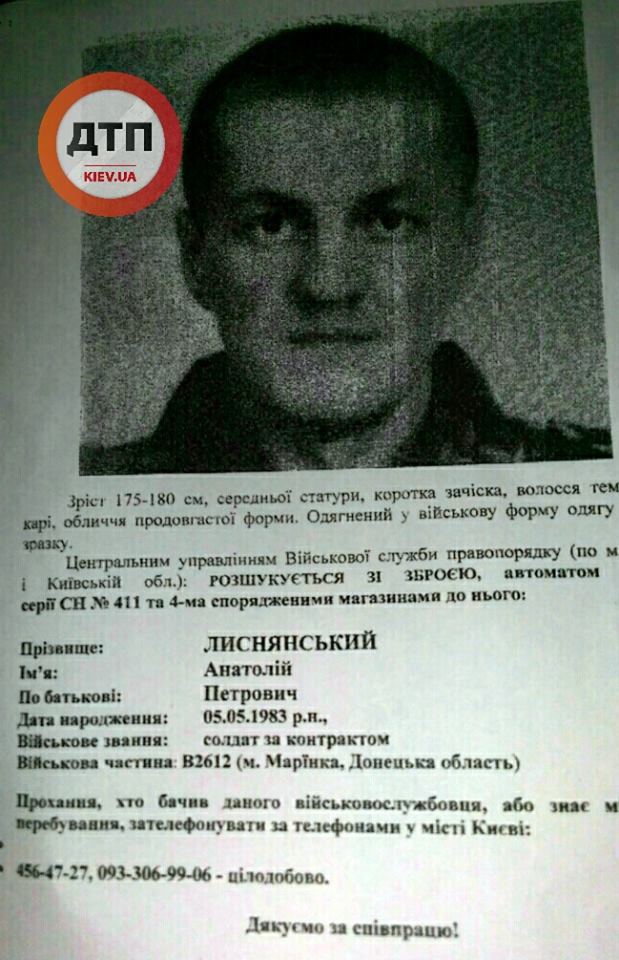 «Из военной части В2612 (Марьинка, временно оккупированная территория ДНР — ред.) сегодня, 29 июля сбежал военнослужащий по контракту Лиснянский Анатолий Петрович 1983 года. Он вооружен автоматом и имеет при себе 4 полных магазина с патронами», — говорится в сообщении.