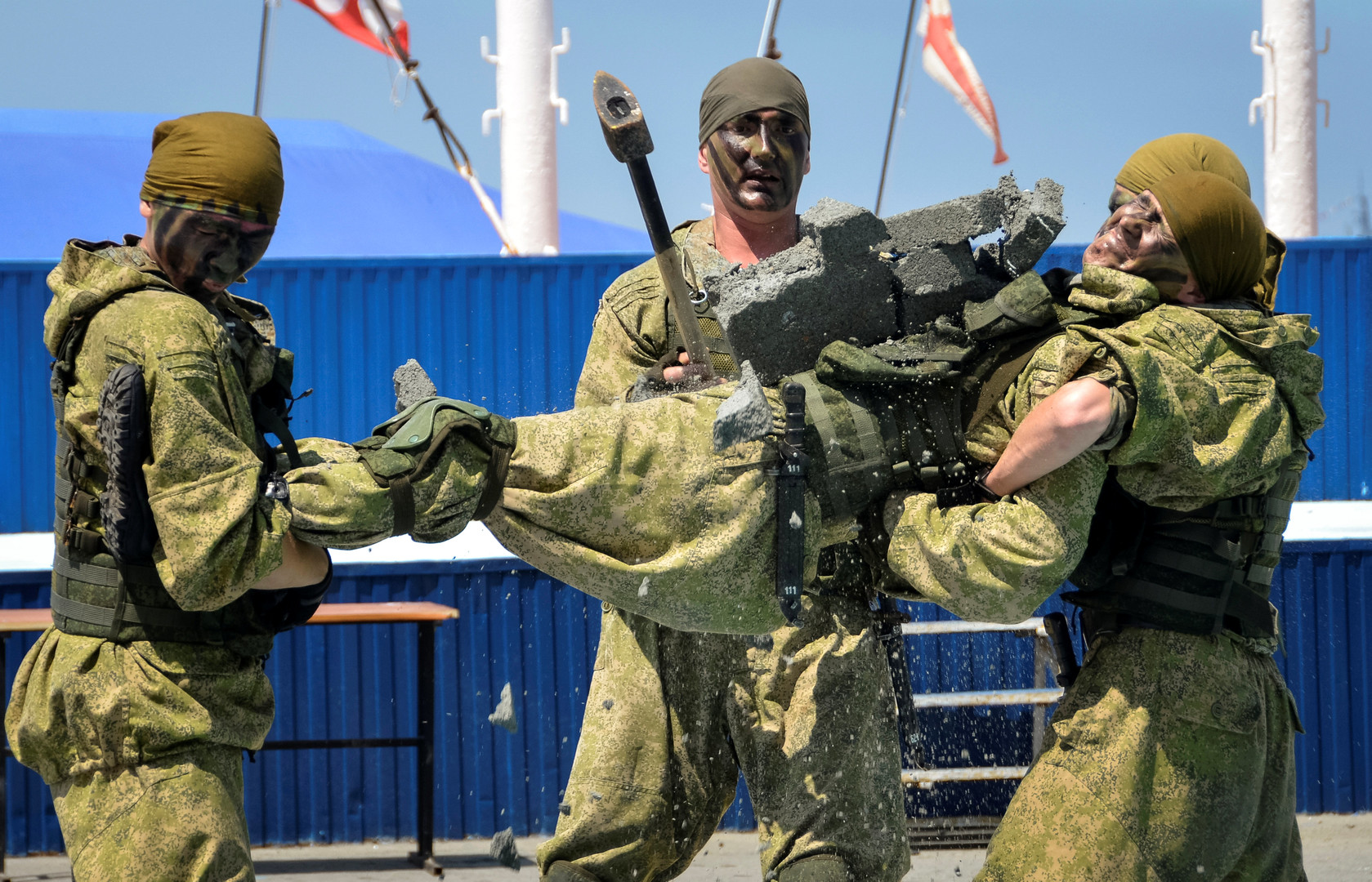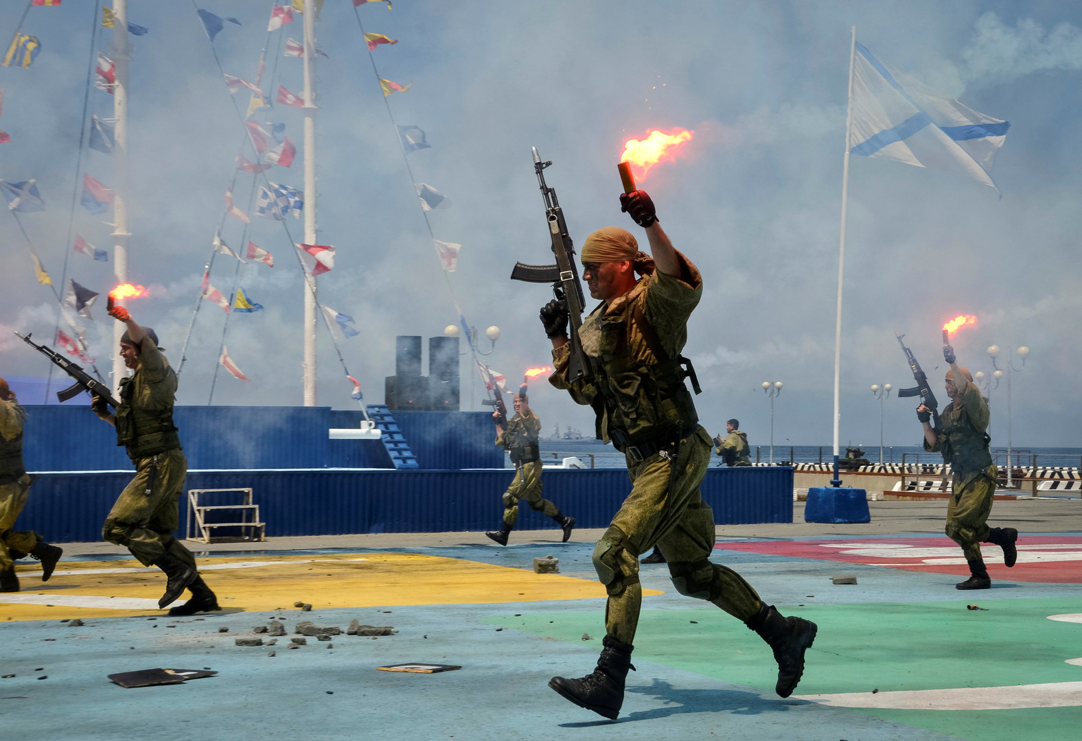 В мероприятии приняли участие военные корабли и подводные лодки, суда произвели пуски ракет. Своё умение продемонстрировали военно-морские десантники.
