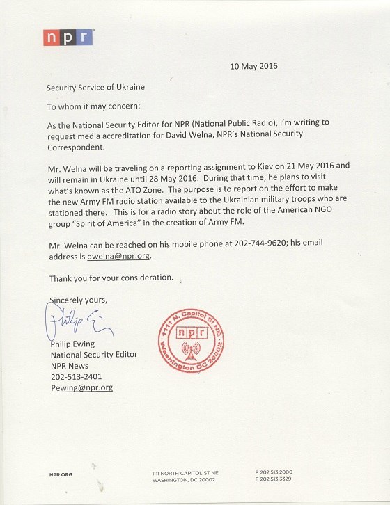 Г-н Уэлн приедет по запрашиваемому назначению в Киев 21 мая 2016 года и останется в Украине до 28 мая 2016 г. В течении данного времени он планирует посетить так называемую Зону АТО (интересно, что даже для американских кураторов зона АТО — «так называемая»). Цель состоит в том, чтобы сообщить о попытке создать новую радиостанцию Армия FM — доступную для украинских вооруженных сил, которые размещаются там. Это необходимо для радио-репортажа о роли NGO group в создании Армия FM.