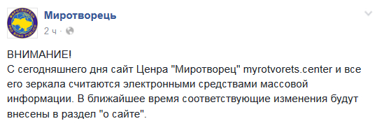 «С сегодняшнего дня сайт Центра “Миротворец” и все его “зеркала“ считаются электронными средствами массовой информации», — сказано в сообщении на странице в Facebook.