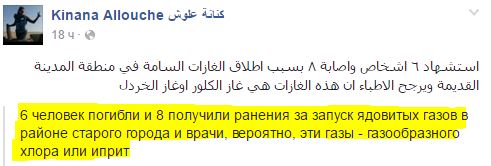 По данным государственного информационного агентства «САНА», боевики обстреляли контролируемые правительством кварталы города боеприпасами, наполненными ядовитым газом. В результате погибли по меньшей мере 5 человек, еще 8 пострадали и были госпитализированы.