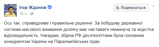 «Вот так, справедливое и правильное решение… Напомню, сборная РФ десятилетиями была главным конкурентом Украины на Паралимпийских играх», — написал Жданов на своей странице в Facebook.