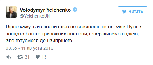 «Верно говорят: из песни слова не выкинешь. После заявлений Путина слишком много тревожных аналогий. Теперь живем надеждой, но готовимся к худшему», — написал Ельченко на своей странице в Twitter.