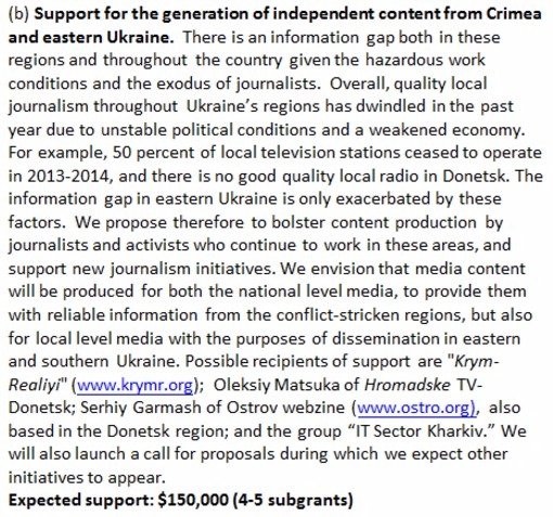 Среди документов есть списки выдачи грантов журналистам и медиа-центрам. В частности, предлагается оплачивать работу около ста журналистов, которые бы освещали события в Крыму и на Донбассе. В одном из документов отмечается, что финансирование составит порядка 500 тысяч долларов в год при помощи грантов и технической помощи. Среди реципиентов перечисляются, в частности, информационные порталы Крым. Реалии, Громадське ТВ, Остров.