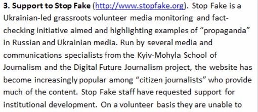 Также предлагается поддержка сайта StopFake, якобы разоблачающего «российскую пропаганду». В фонде Сороса отмечают, что StopFake будет сотрудничать с зарубежными порталами аналогичного формата, в частности — с российским центром СОВА, и потребует финансирования порядка 50 тысяч долларов на развитие как самого сайта, так и сетей.