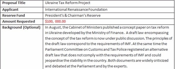 Также Фондом предлагается выделить 100 тысяч долларов на проект налоговой реформы в Украине. У Сороса отмечают, что ранее опубликованный черновой вариант законопроекта критикуется в обществе, хотя и полностью совпадает с позицией МВФ.