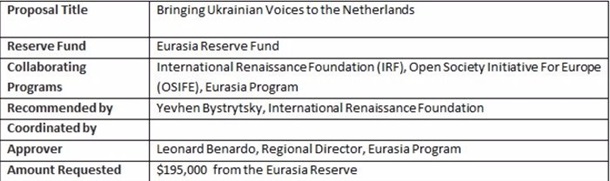 195 тысяч долларов фонд предложил выделить и на донесение позиции Украины до Нидерландов перед проведением в этой стране общенациональном референдума о ратификации соглашения об ассоциации Украины с ЕС.