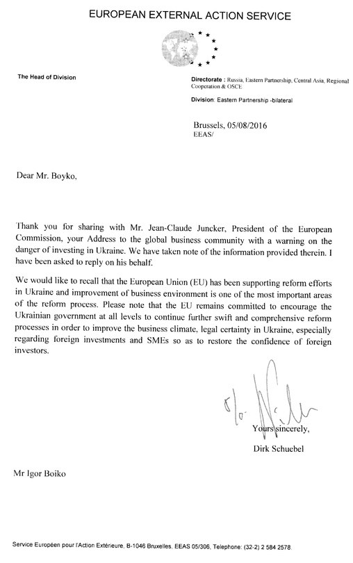 Об этом говорится в официальном письме, которое было отправлено из офиса президента Европейской комиссии Жана-Клода Юнкера 5 августа 2016 года владельцу захваченной рейдерами Житомирской кондитерской фабрики «Житомирські Ласощі» гражданину США Игорь Бойко