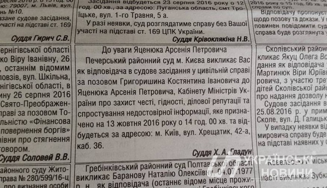 «К вниманию Яценюка Арсения Петровича. Печерский районный суд Киева вызывает вас как ответчика на судебное заседание в гражданском деле по иску Константина Григоришина к Яценюку и Кабмину о защите чести, достоинства, деловой репутации и опровержении недостоверной информации, а также опровержение неправдивой информации», — сказано в заметке.